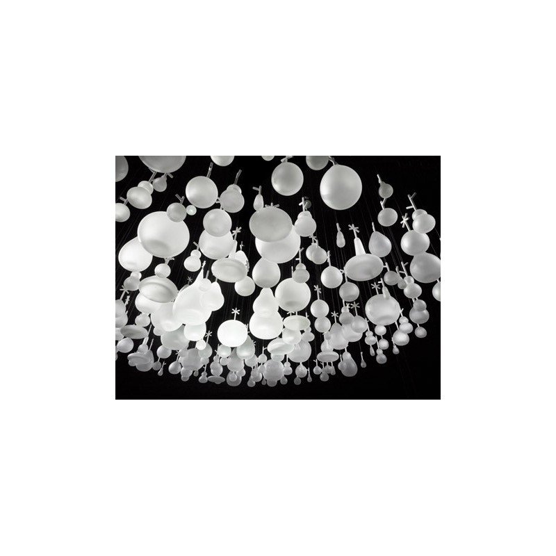 The chandelier Growing Vases is an art piece, which conveys the quixotic appeal of glass as something impractical and incomplete yet provides a breath of fresh air and opens up new possibilities. Created with glass, this lighting installation of whimsical nature, alludes to a whimsical glass forest filled with abstract flowers and branches.