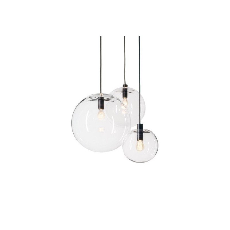 Selene Pendant lamp. Clear, blown-glass sphere. Centrally suspended by a five-armed light head. Insect protection cover and light head powdercoated metal. Bulbs with decorative filament. Glass spheres in different sizes.