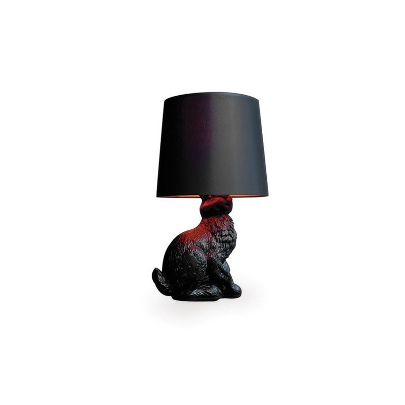 The friendly rabbit made from black lacquered glass fibre serves as decorative lamp base and is crowned by a plain shade made from pvc and cotton laminate. A rabbit as decorative object might seem a bit old-fashioned at first sight, but the black and metallic design adds a very original and charming touch to the interior.
