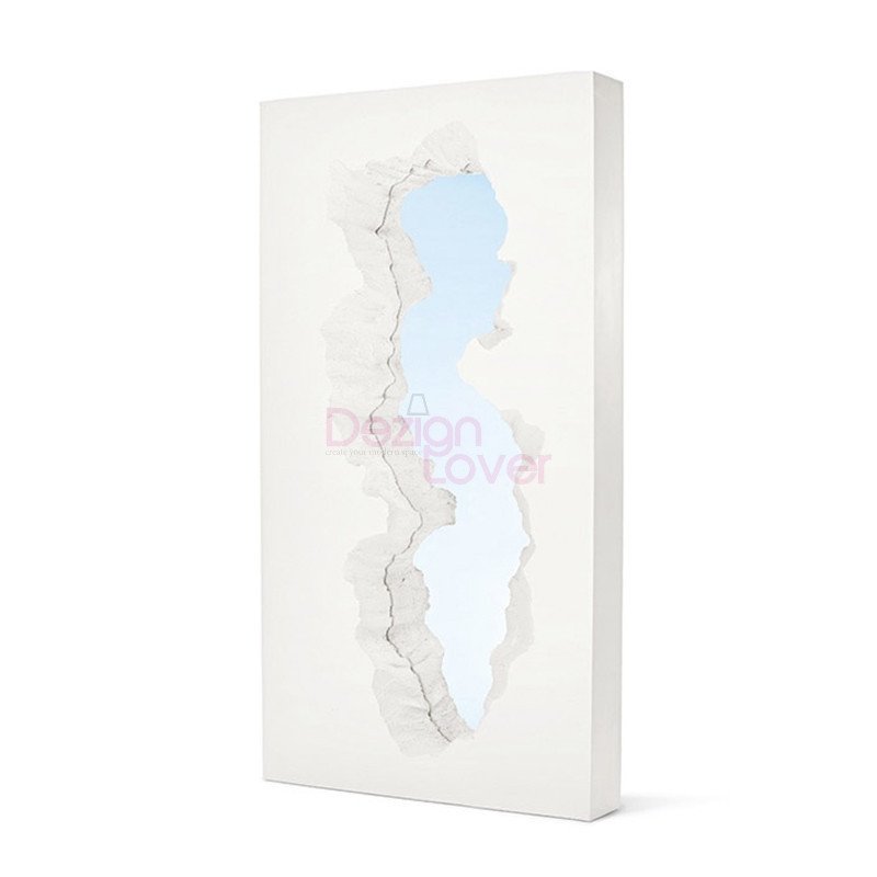 Broken Mirror est un miroir entouré d'un cadre en polyuréthane souple qui prend la forme d'une brèche dans le mur, une fissure qui reflète l'espace qui l'entoure, mais en même temps crée un effet optique étrange comme si la pièce était ouverte au monde extérieur ou à un autre environnement.