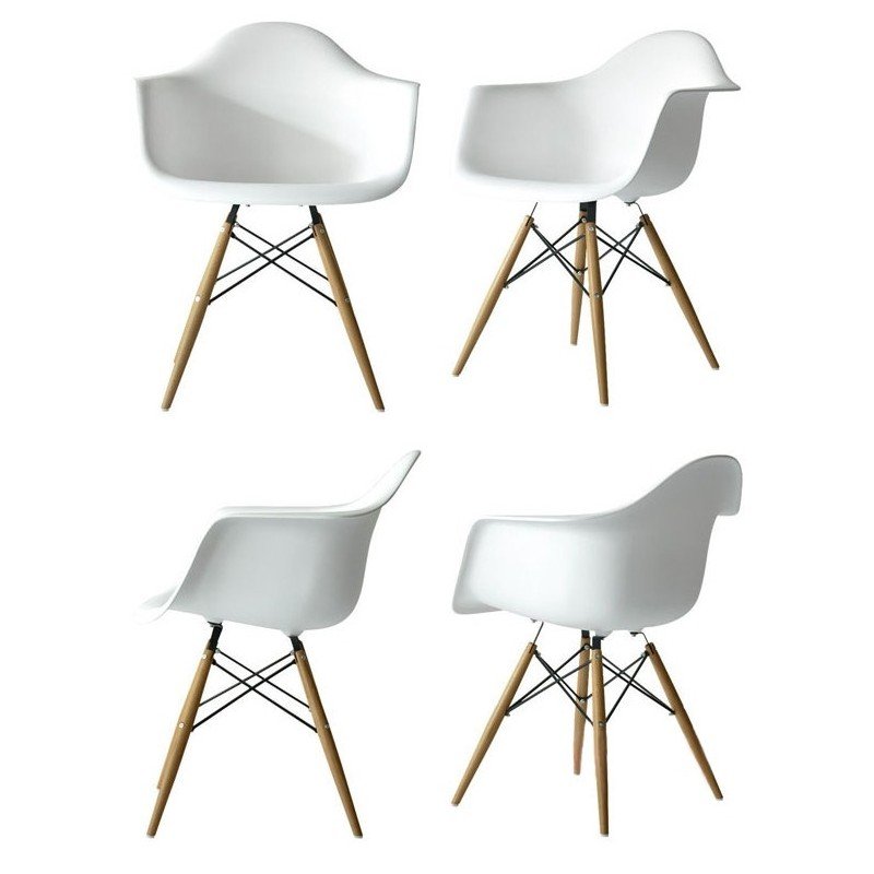 La chaise DAW, dessinée en 1950, est composée d'une coque en fibre de verre teinté et d'une base en érable aux montants croisés.