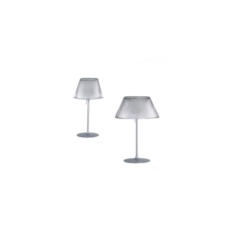 La lampe de table Romeo Moon avec diffuseur externe en verre pressé transparent et câbles de suspension en acier est disponible en deux dimensions: Romeo Moon T1 et Romeo Moon T2.