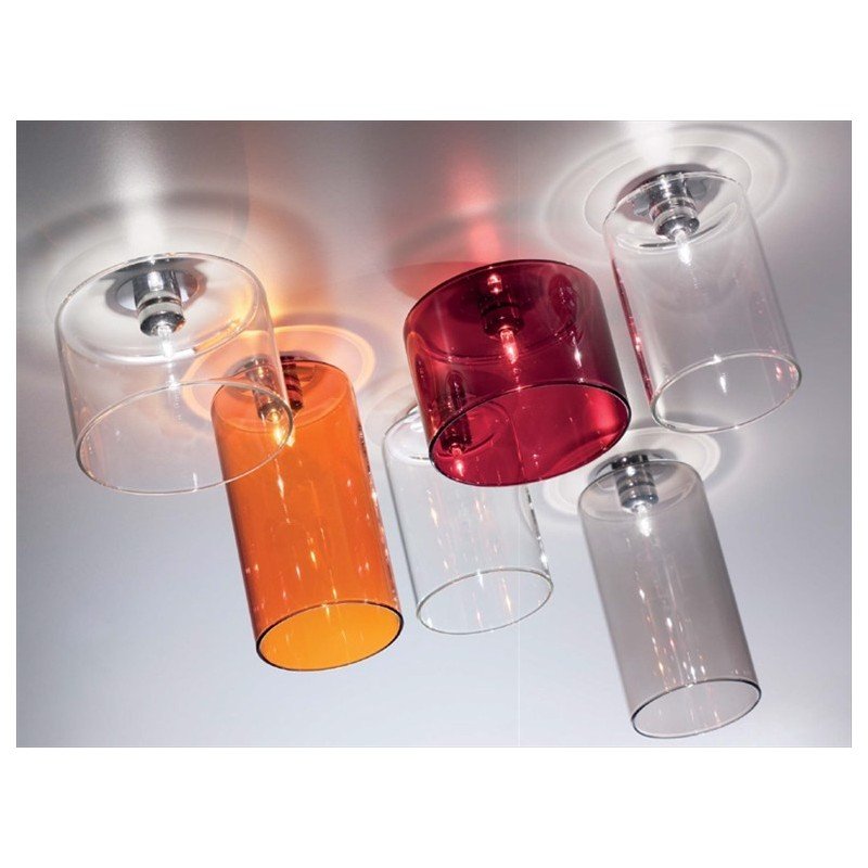 Plafonnier composé d'une base plafond à encastrer, d'un câble d'alimentation et d'élingue gainé de tissu gris et d'un diffuseur cylindrique en verre transparent.