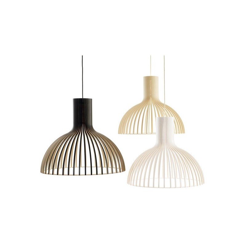 La suspension Victo a un abat-jour en bois en forme de dôme, composé à la main de lamelles de bois de bouleau pressées. Il se compose d'une pointe cylindrique et d'un large hémisphère convexe. La lumière brille vers le bas, mais passe également latéralement entre les lattes de bois. Victo est disponible en deux tailles et est proposé dans diverses couleurs, que ce soit en bouleau naturel ou recouvert de stratifié blanc ou noir ou de placage de noyer sur le côté extérieur. Un câble textile et une rosace en forme d'entonnoir, en noir ou blanc assorti, complètent le design.