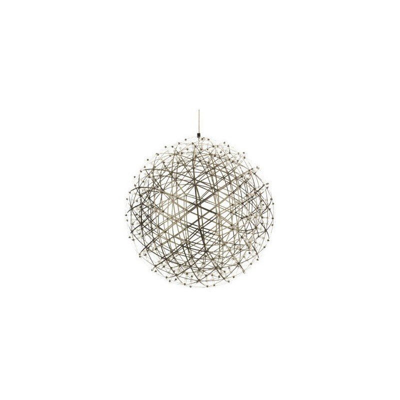 La suspension Raimond LED semble semée d'étoiles lorsqu'elle est allumée dans le noir. Elle est composée de deux structures superposées, l'une interne et l'autre externe, toutes deux reliées par des diodes lumineuses blanches à leurs points de jonction.