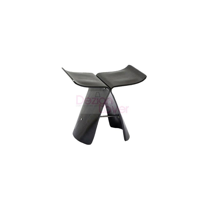 Ce tabouret aux lignes pures et sculpturales se compose de deux panneaux en bois incurvés reliés et maintenus entre eux par un simple câble en métal.